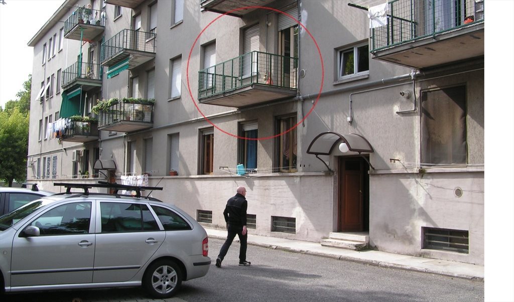 For rent: a 64 m² apartment located on the 1st floor of a building at Via Assietta 9, Milan, inside a large 12,000 m² courtyard featuring green areas, flower beds, parking spaces and bicycle racks. The courtyard comprises three additional neighbouring buildings, forming a quiet and well maintained residential setting.