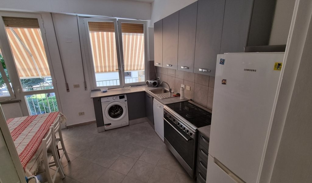 Ampia cucina con terrazzo con lavatrice, lavastoviglie, frigorifero, cucina a 5 fuochi con grande forno.