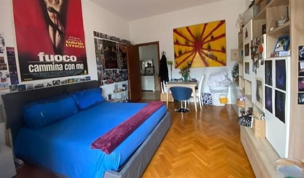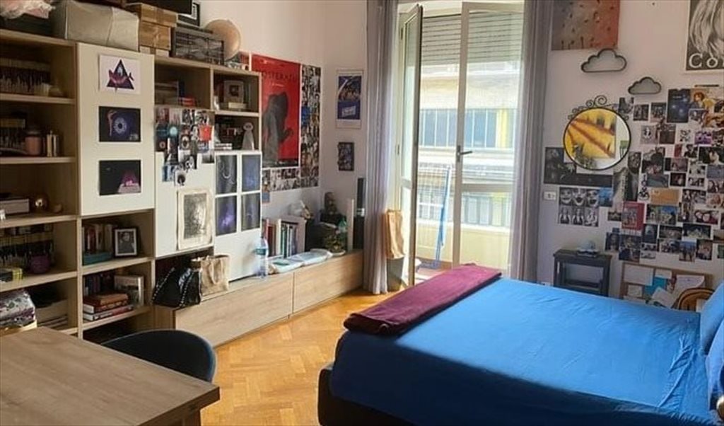 La stanza è molto ampia con letto matrimoniale, cassettone, una grande libreria e un tavolo; ha accesso diretto al balcone, abbastanza grande da avere un tavolino da esterno. L'armadio, a 5 ante, è fuori dalla camera, per cui lo spazio a disposizione è molto. In più la conformazione della casa consente estrema privacy, dal momento che la mia stanza è distante. In casa ci sono solo io come coinquilina e il mio gatto, estremamente tranquillo.