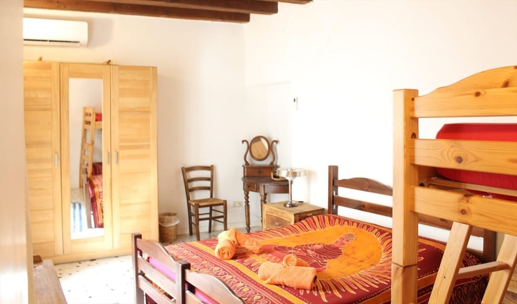 (white and red patterned bedspread, red and orange towels, large wardrobe, bunk bed, private small balcony)