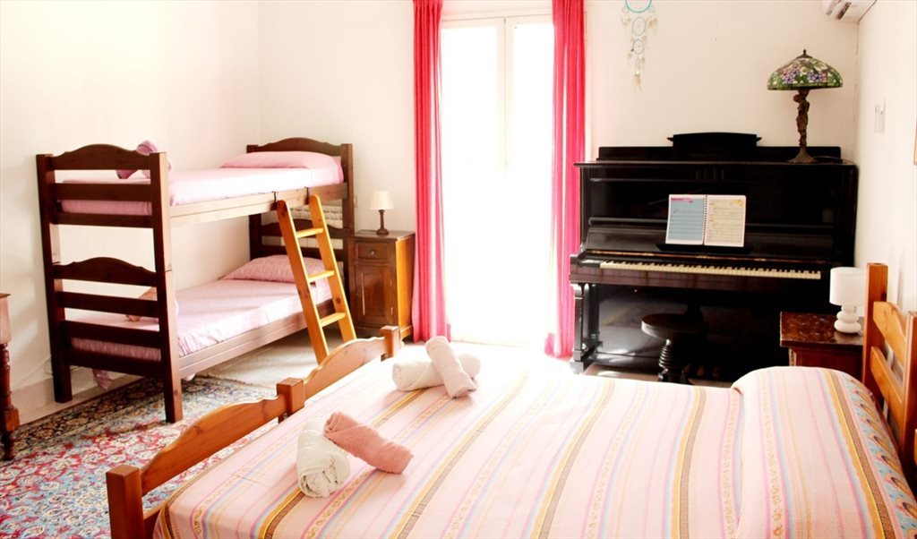 (pink bedspreads, Persian rugs, piano, bunk bed)